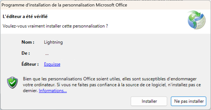 3. A window will pop-up, asking your authorization to install a “Microsoft Office Customization”. Click OK, this is your Lightning add-in.